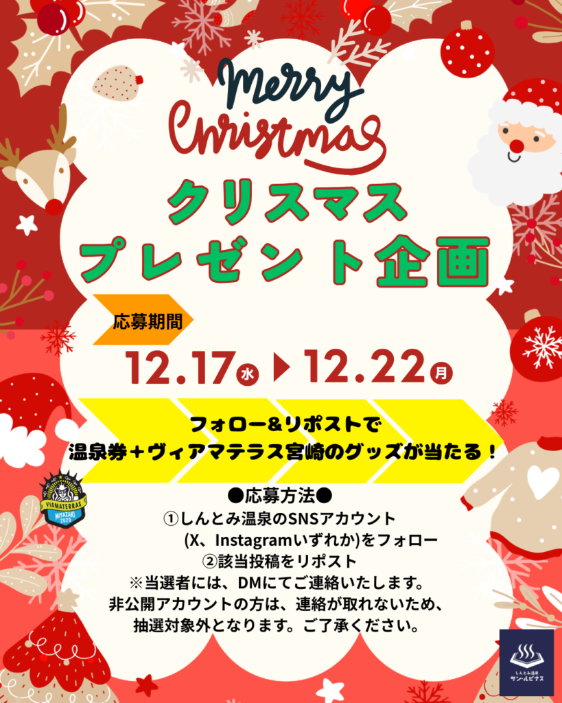 しんとみ温泉の公式SNSアカウント(@sunlupinus23)をフォロー&該当投稿をリポストすると、抽選で温泉入浴券&ヴィアマテラス宮崎のグッズが当たります‼️