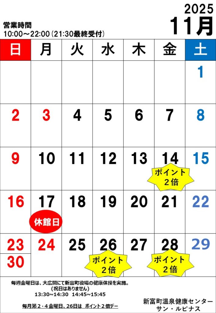 11月休館日のお知らせ 2025年11月1日 最終更新日時 : 2025年11月2日 sun-lupinus 11月の休館日をお知らせいたします。11月休館日:11月17日(月) ▼11月営業カレンダー